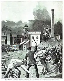 The Federated District unions maintained their levels of pay until 30 June 1893, when mine owners in the district collectively announced a 25% cut in wages. This was strongly opposed by the MFGB. At the end of July, unionised miners in most pits in the district were locked out, with just a few strikebreakers continuing to work. At some pits, no notice of a proposed reduction had been given, and miners instead initiated strike action themselves, although there were a handful of these pits where work continued. However, the miners in Durham, Northumberland and Monmouthshire did not take part in the co-ordinated action, and their unions resigned or were expelled from the MFGB. During August, there was a stand-off, but at the start of September, there were widespread clashes between striking miners and strikebreakers in Yorkshire. Troops were deployed to the areas where violence had occurred, and the Yorkshire Miners' Association called for peace. On 7 September, two miners were killed by troops in Featherstone, in what became known as the "Featherstone Massacre".[1][2]