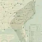 The storm had generally minor effects in Florida, mostly limited to coastal flooding in northeastern portions of the state.[41] The Mid-Atlantic coastline experienced flooding storm tides that inundated and greatly eroded Cobb's Island, part of the Virginia Barrier Islands. Hotels and cottages there were extensively damaged.[32] The storm claimed about 50 acres (20 ha) of Cobb's Island, reducing its size by two-thirds; subsequently, the inhabitants abandoned the island and its use as a resort ended.[42] Along the Jersey Shore, low-lying railroads were flooded, boardwalks were destroyed, and many beach houses sustained damage.[41][43] The hurricane did $200,000 in damage to coastal installations on New York's Coney Island.[44] To the north, wind gusts as high as 80 mph (130 km/h) affected eastern New England, where shipping interests were heavily impacted by the storm.[1] Three sailors died when a schooner went aground along the coast of Delaware,[45] and another was tossed overboard while battling rough seas offshore.[44] Overall damage amounted to $500,000.[43]