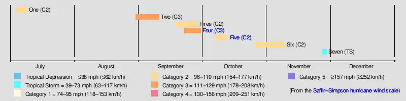The 1896 Atlantic hurricane season was fairly inactive but produced one of the costliest hurricanes ever to strike the United States until that point, along with several other destructive tropical cyclones. The season began in early July with a hurricane in the Gulf of Mexico and ended in late November with a slow-moving tropical storm over the Lesser Antilles. Of the season's seven documented systems, six are believed to have become hurricanes, and two intensified into major hurricanes—the equivalence of Category 3 or greater on the modern-day Saffir–Simpson scale. All but one of the systems directly affected land to some degree; Hurricane "Six" remained over open water and only posed a threat to shipping lanes. In addition, a possible storm was identified off the coast of North Carolina on August 28–29, but modern reanalysis efforts have found insufficient evidence to classify it as a tropical cyclone.[1] Tropical systems in the 1896 season killed at least 286 people and inflicted more than $10 million (1896 USD) in damage.