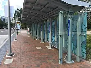Initially, the station was a sidewalk-level bus stop. It was upgraded on April 17, 2016.[2]