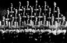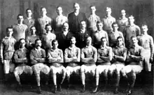 The captain of Tasmania was Bruce Carter.[25] The squad originally selected was: from the South: Roy Bailey (half back), P. Orpwood (back), Walter Burrell (following and back), L. Bridges (wing), Weller Arnold (centre), C. Ward (centre and half-back), E. RusseIl (wing), W. Lee (forward and rover), T. Abel (follower), C. Webb (follower and back), W. Forster (rover and half-forward); from the North: Algy Tynan (full back), A.J. "Barney" Badcock (half-back), W. Ride (back), B.L. Thomson (back), Charlie Searl (wing), Hastings Woolley (half-back and follower),[26]Joe Littler (forward), Viv Valentine (forward); from North-West Coast: B. Carter (centre), W. Rutter (follower), T. Mahoney (follower); from West Coast: A. Trotter (centre and forward), George McLeod (forward and follower). Emergencies: K. Appleby (North-West), first back and follower; Norman F Pannam (North West), first forward and second follower; L. Norman (North), rover and third forward; A. Tucker (South) second back and wing; B. Filgate (North-West), full back and wing.[27] During the carnival, the Tasmanian team, coached by Jack Gardiner and Dick Gibson,[28] trained at the South Melbourne Cricket Ground.[29]