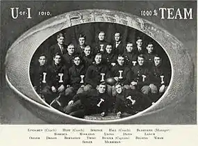The 1910 Illinois Fighting Illini football team was an American football team that represented the University of Illinois during the 1910 college football season. In their fifth season under head coach Arthur R. Hall, the Illini compiled a 7–0 record, outscored opponents 89 to 0, and finished in first place in the Western Conference.[1] Guard G. D. Butzer was the team captain.[2]