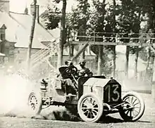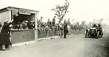 Initial enthusiasm to revive the Grand Prix was high, but as manufacturers cancelled their entries, the French Automobile Club (ACF) had to cancel its plans.[13] It did, however, support the AC de la Sarthe et de l’Ouest[14] (forerunner of the Automobile Club de l'Ouest) who offered to hold an event in its stead. They had organised the original Grand Prix in 1906, outside of Le Mans. This alternative “Grand Prix de France” used a new 55km triangular circuit to the south of Le Mans. But after this race too was postponed a fortnight more entries drifted away leaving only fourteen starters, the media cynically tagged it as Grand Prix des Vieux Tacots (The Old Crocks’ Grand Prix).[14][13] Only FIAT (Victor Hémery) and Rolland-Pilain (3 cars, led by Fernand Gabriel) brought works cars. Run over twelve laps (650km) Maurice Fournier (Corre La Licorne) led initially from Arthur Duray (1906 Lorraine-Dietrich) until he had to pit with over-heating to add water. He had just been overtaken by Hémery, back to third, when his front suspension collapsed when approaching Mulsanne village. The car rolled, crashed and burst into flames. Fournier was thrown out and killed instantly while Louvel, his riding mechanic, had burns and broken bones. When Duray then had gearbox problems and retired, it left Hémery an easy drive to victory (despite being stuck in top gear[13]) after seven hours. Ernest Friderich driving the first racing Bugatti (the small 1.3-litre Type 13) finished second two laps behind and Gabriel was third, a further lap back.[14][15][13]