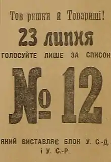 Ahead of the election the Ukrainian socialist parties had decided to launch a list of their own, in protest of what they saw as the 'anti-Ukrainian campaign' in the Russian socialist press.[4] On the other extreme stood the Bloc of Russian Voters, one of the Russian nationalist groups that had emerged in response to the formation of the Central Rada in March 1917.[5][6] Their main electoral slogan was 'Down with Ukraine and Ukrainization'.[6]