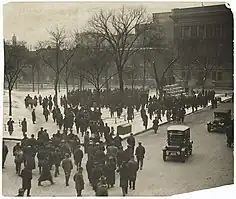 On November 19, the committee released its recommendations, which included a ban on button-wearing by the streetcar workers and the prohibition of the union to solicit and propagandize on company property, which included the carbarns and the streetcars.[36] The MCPS adopted the committee's recommendations in full the following day, with the company given the ability to enforce the recommendations.[36] While both the company and the union had agreed to the button recommendation, the union had not agreed to the ban on soliciting and propagandizing, and after discussing the matter with the MCPS, the union agreed to hold a vote on November 26.[36] However, the company learned of the planned vote and on November 25 ordered that anyone seen wearing a button or soliciting would be fired immediately.[36] This resulted in a lockout of about 800 union members who had refused to comply with the company's demands, and the union viewed the move as an effort by the company to break the union.[36][32] These 800 men would later be fired by the company.[13] While the union contended that the recommendations did not carry the force of law and were thus unenforceable by the company, the MCPS, which supported the company, passed an order on November 27 that gave the recommendations the force of law, though the order also stipulated that the 800 men would be rehired.[36] However, the union still refused to comply.[36] That same day, the CCA reorganized the Minneapolis division of the American Protective League (APL), an organization nominally under the direction of the United States Department of Justice's Bureau of Investigation whose goal was to employ surveillance on certain groups during the war.[37] Approximately 400 members of the CCA joined the APL, which was headquartered in the local federal building.[37]
