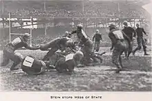 Center Herb Stein was elected Captain for the 1920 season on the third ballot at the annual football banquet. Tom Davies was the runner-up.[85] The following players received the varsity "P" for the 1919 season: James DeHart, Tom Davies, Andy Hastings, James Morrow, Fred Ewing, Frank Eckert, Harvey Harman, James Bond, John McLean, Alex Meanor, Herb Stein, John Laughran, G. Herb McCracken, Thomas Hamberger, Abe Breman, Cliff Brown, John McCrory, W. J. Thomas, Oscar Kratzert, Alvar Ginn, Gus Aschman, Lou Mervis and W. J. Foster.[86]
