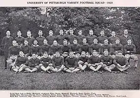 The 1920 Pittsburgh Panthers football team was an American football team that represented the University of Pittsburgh as an independent during the 1920 college football season. In its sixth season under head coach Pop Warner, the team compiled a 6–0–2 record and outscored all opponents by a total of 146 to 44.[1][2] The team played its home games at Forbes Field in Pittsburgh. “Perhaps due to the resurrection of sports after the war period, Pitt enjoyed an athletic year that was quite indicative of its pre-war strength, which so practically dominated college sport activities in this section for many years. The season of 1920-21 boasted of representative Pitt teams in every branch of sport - football, basketball, baseball, track, swimming and tennis. Aviation, which made its initial bow at the University last year, progressed in fine manner – the team having been entered in the big intercollegiate meet.″[3]