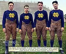 Three of the Four Horsemen, Stuhldreher, Crowley, and Layden, were consensus first-team picks on the 1924 All-America college football team.[4] Other notable players included tackle Joe Bach and center Adam Walsh. The Four Horsemen, Walsh, and coach Rockne were all later inducted into the College Football Hall of Fame.[5][6][7][8][9][10]