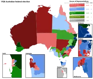 The 1928 Australian federal election was held in Australia on 17 November 1928. All 75 seats in the House of Representatives and 19 of the 36 seats in the Senate were up for election. The incumbent Nationalist–Country coalition, led by Prime Minister Stanley Bruce won a record fifth consecutive election defeating the opposition Labor Party led by James Scullin.