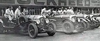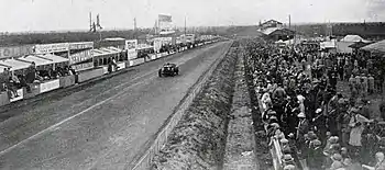 Once again, the race began under grey clouds and drizzling rain.[1][4] First away were the DuPont and the Lagonda but Birkin, in the big Bentley Speed Six, was in the lead under the Dunlop bridge.[4] Left at the line was the D’Yrsan with Trillaud losing seven minutes pushing the car up the road trying to get his engine fired (technically a disqualification offense).[14][4] At the end of the first lap Birkin had already set a new lap record of 7m57s, from a standing start.[19] The other Bentleys of Clement, Kidston and Benjafield were in formation behind, chased by the Stutzes of Bouriat and Eyston.[1] Howe was next, though he soon moved up as the rain stopped to join his teammates, with Benoist and Mongin in their Chryslers and Moran's DuPont making up the top ten.[20] Already there was a sizeable gap (over a kilometre) back to the Lagonda leading the smaller cars.[1]