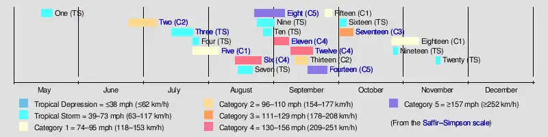 Fourteen September 16–25  Category 5 hurricane 160 (260) 929 Cayman Islands, Yucatan Peninsula, Tamaulipas $10 million 184