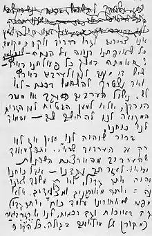 The 1937 Ben-Gurion letter is a letter written by David Ben-Gurion, then head of the executive committee of the Jewish Agency, to his son Amos on 5 October 1937. The letter is well known to scholars[1] as it provides insight into Ben-Gurion's reaction to the report of the Peel Commission released on 7 July of the same year. It has also been subject to significant debate by scholars as a result of scribbled-out text that may or may not provide written evidence of an intention to "expel the Arabs" or "not expel the Arabs" depending on one's interpretation of whether such deletion was intended by Ben-Gurion.