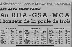- ↑ Résultat de la 11e journée du Critérium de Guerre d'Alger de football 1939-1940, paru dans "L'Echo d'Alger", 29e année, N° 10789 daté du Monday 19 février 1940, page 4.