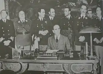 Nevertheless, the coup of 4 June 1943 was not foreseen by anyone and was carried out with a great deal of improvisation and, unlike the other coups that had occurred in the country, almost without civil participation.[16] According to historian José Romero, it was a "rescue maneuver of the group committed to the Nazi infiltration, complicated by its preventing Castillo from turning toward the United States.[17]