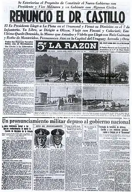 The 1943 Argentine coup d'état, also known as the Revolution of '43, was a coup d'état on 4 June 1943 that ended the government of Ramón Castillo, who had been fraudulently elected to the office of vice-president before succeeding to the presidency in 1942[1] as part of the period known as the Infamous Decade. The military was opposed to Governor Robustiano Patrón Costas, Castillo's hand-picked successor, a major landowner in Salta Province and a primary stockholder in the sugar industry. The only serious resistance to the military coup came from the Argentine Navy, which confronted the advancing army columns at the Navy Petty-Officers School of Mechanics.