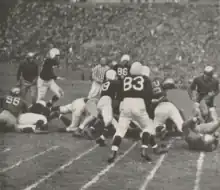 On September 25, Pitt, wearing their red jerseys, opened the season against third-year coach Frank Leahy's Notre Dame Fighting Irish. The all-time series was tied 5–5–1, but the teams had not met since 1937, when Jock Sutherland was coach.[30] Notre Dame had a V-12 Navy College Training Program on their campus and 29 of the 35 men on the travel squad were Navy or Marine trainees. Pitt countered with a squad of freshmen and 4-Fs.[31]