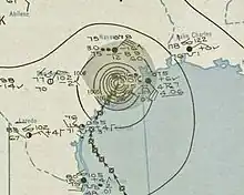 Damage from the hurricane throughout Florida was relatively minor. Citrus trees were stripped of their branches, roadways were washed out, and some telephone and power lines were toppled, temporarily severing communication.[5] Tampa recorded a record 24-hour rainfall total of 10.42 in (265 mm),[3] while precipitation peaked at 13.6 in (350 mm) in Lake Alfred.[6] Statewide, the heavy precipitation was regarded as beneficial in ending one of the worst recorded droughts there.[3] Two tornadoes were spawned; one blew a transformer off a platform and ripped a section of railing off a causeway, while both damaged some homes. Total damage reached $75,000 throughout Miami.[7] Farther north, telephone communications around Georgetown, South Carolina were disrupted, while winds gusted as high as 69 mph (111 km/h) and rainfall peaked at 5.58 in (142 mm) in Charleston.[8] In Wilmington, North Carolina, 8.24 in (209 mm) of rain was observed, causing considerable damage to the city's storm sewer system.[9] Although the core of the cyclone passed east of New England, at least 10,000 telephone lines were downed by the storm. Buildings, crops, and trees were damaged, while low visibility led to a traffic accident that killed a man in Warwick, Rhode Island.[10]