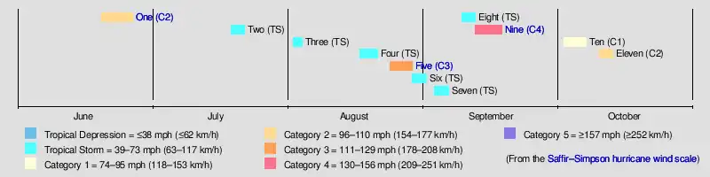 Eleven October 10 – 13 Category 2 hurricane 100 (160) 982 Greater Antilles, The Bahamas $2 million 5