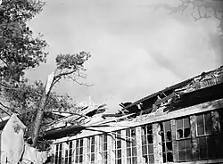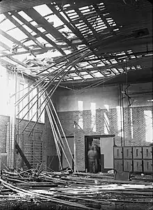![]() The damaged gym of the Hogere Burgerschool in Apeldoorn after the crash with in the bottom left corner a piece of the Fairey Firefly | |