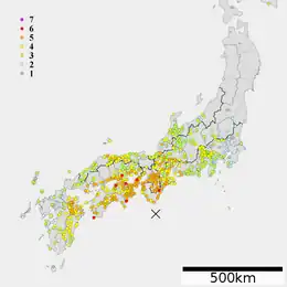 The 1946 Nankai earthquake (昭和南海地震 Shōwa Nankai jishin) was a great earthquake in Nankaidō, Japan. It occurred on December 21, 1946, at 04:19 JST (December 20, 19:19 UTC).[1] The earthquake measured between 8.1 and 8.4 on the moment magnitude scale, and was felt from Northern Honshū to Kyūshū. It occurred almost two years after the 1944 Tōnankai earthquake, which ruptured the adjacent part of the Nankai megathrust.