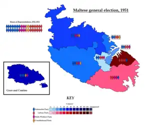 Early general elections were held in Malta between 5 and 7 May 1951.[1] They came less than a year after the previous elections as a result of disagreements in the coalition government formed by the centre-right Nationalist Party and centre-left Malta Workers Party. Although the Malta Labour Party received the most votes, the Nationalist Party remained the largest party, winning 15 of the 40 seats. Despite their previous disagreements, the Nationalist Party and Workers Party formed a new government.
