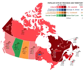 The Progressive Conservative Party, led by former Premier of Ontario, George Drew, formed the official opposition, however for the last time until 1993, the party was unable to win the popular vote in any of Canada's provinces or territories.