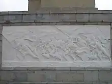 On the sides of the monument's pedestal are reliefs depicting heroic people of Wuhan fighting the flood, raising banners and placards with quotations from Mao Zedong.