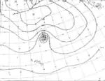 Although at an unusual latitude, the storm maintained this intensity for over a day before weakening to a tropical storm.[2] During the afternoon of August 13, the small system re-intensified into a hurricane. Reconnaissance reported that gale-force winds extended no more than 100 mi (160 km) from the storm's eye.[3] Shortly thereafter, the system further intensified into a Category 2 hurricane, attaining maximum winds of 105 mph (170 km/h).[2] Weather maps at the time depicted the storm as having a minimum pressure of 987 mbar (hPa).[3] By August 14, the storm began to weaken once more, gradually becoming a tropical storm on August 15. After turning northward, the cyclone became extratropical at a high latitude of 39.8°N.[2][3]