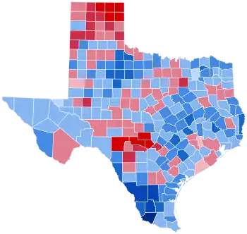 Fears of anti-Catholic voting in West Texas, which had given Herbert Hoover a narrow win over Al Smith in 1928,[3] were not entirely realized. It is notable that the sparsely populated rural Plains counties of Armstrong, Bailey, Childress, Collingsworth, Dallam, Dawson, Donley, Floyd, Gaines, Hale, Hardeman, Hartley, Moore, Motley, Parmer, Wheeler, Willbarger and Yoakum switched from Stevenson to Nixon, as did Wise County north of Fort Worth, while a further thirty-eight counties saw Kennedy fail to reach Stevenson's vote percentage.[4] However, this was more than offset by Kennedy's gains in heavily Hispanic Catholic South Texas, where few Mexicans had voted in 1928.[5] Anti-Catholic voting was also lessened by appeals from former President Harry Truman, who campaigned for Kennedy and Johnson.[6] As of the 2020 presidential election, this is the last time Glasscock County voted for a Democratic presidential candidate.[7]