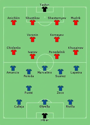 The final was played at the Santiago Bernabéu Stadium in Madrid on 21 June 1964 in front of 79,115 spectators.[31] Spain's Suárez struck an early free kick over the Spain crossbar before his pass to Marcelino was cut out by Yashin. In the sixth minute, Marcelino dispossessed Ivanov, took the ball past Eduard Mudrik and after making a one-two with Lapetra, crossed for Pereda who scored to give Spain a 10 lead. Two minutes later, Viktor Anichkin passed to Galimzyan Khusainov down the left side of the pitch and his weak shot was mishandled by the Spain goalkeeper Iribar to allow the equaliser. Despite the two early goals, the remainder of the half saw both sides competing in the midfield with several misplaced passes and fouls, although Yashin saved shots from both Pereda and Fusté before Iribar kept Chislenko's attempt out.[33][34]