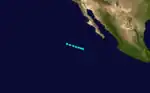 The last tropical cyclone of the season, Tropical Storm Tillie, developed on September 7. At first, the cyclone moved north-northwest;[3] Tillie reached its peak intensity of 60 mph (95 km/h) at that time of its formation approximately 150 mi (240 km) west of Mazatlan.[5] Early on September 8, while located about 100 mi (160 km) southwest of Cabo San Lucas, Tillie began a gradual turn towards the west-northwest. Tropical Storm Tillie dissipated at 0600 UTC on September 9[3] off the coast of California,[9] having only been a tropical cyclone for just over two days.[3]