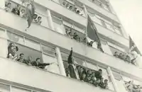 A Navy helicopter and a yellow plane flew over the Union. Curious family members and girlfriends brought supplies and cigarettes.[64] The emotion inside was one of distress, with the sailors feeling defensive. Statements by Anselmo and Antônio Duarte also describe a loss of control; Duarte points, in particular, to "Tatá's" speech as destabilizing.[65] On the other hand, in making its demands, the movement was not on the defensive.[66]