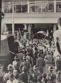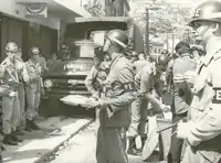 The officialdom demanded that the sailors leave, "dead or alive."[58] The Marine Corps Police Company, deployed from Ilha das Cobras, was in charge of the invasion, scheduled for 09:15.[69][lower-alpha 3] 90 marines[70] came in five buses.[41] From inside the Union, the sailors incited the marines and sang the National Anthem. Private Raimundo Nonato Barbosa, disobeying his orders, abandoned his helmet, ammunition, and INA machine gun and joined the sailors. 25 of his comrades repeated the gesture, to the euphoria of the sailors and the amazement of the commanders. The rest of the company had to retreat.[71]