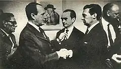 For months before the coup, Auro de Moura Andrade participated in the conspiratorial group of Marshal Cordeiro de Farias and São Paulo Governor Ademar de Barros.[63] In his memoirs, he justified his action at the time of the coup: "no nation can sleep without a president"; "What I needed was to dismiss the president, in order to liberate the III Army and relieve it from fighting against those who had risen up in defense of constitutional integrity".[64] On April 2, the Third Army's adhesion to the coup was still incomplete.[65] Auro also had a personal motive: in July 1962, during the parliamentary regime, the president nominated him as Prime Minister, under the condition that he kept a letter of resignation. Two days later, while Auro was concluding the negotiations for his ministry, Goulart used this letter to remove him from his post.[66]