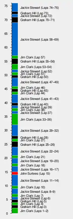 Jim Clark duelled for the lead through the first two-thirds of the race with Graham Hill, Jackie Stewart and John Surtees (who dropped out with clutch problems), until lap 64 when his fuel pump failed. Stewart took up the lead and it was expected that he would move over to give his team leader the victory.[1] The enthusiastic crowd were waiting for the BRM cars to come over the line in formation. However, on the approach to the Parabolica on the last time, Hill moved over too far and bounced across the grass, struggling to maintain grip on the mud and gravel. Stewart therefore claimed his first win in a BRM 1–2 from Hill. Dan Gurney took the final podium place and Lorenzo Bandini, Bruce McLaren and Richard Attwood completed the placings. The race featured 42 lead changes[2] between four drivers (all British), the most ever in a Formula One motor race.[2]