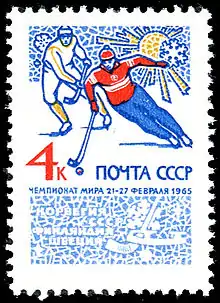 1965 Bandy World Championship on a contemporary Soviet stamp.