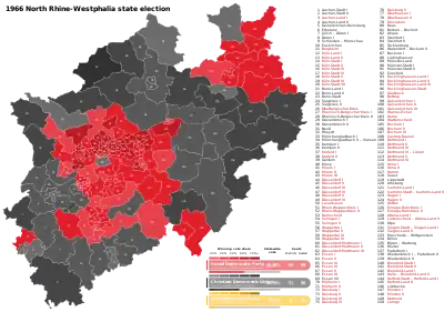 The opposition Social Democratic Party (SPD) became the largest party in the state for the first time, coming just short of a majority with 49.5% of votes and 99 seats. The CDU declined to 43%, and the FDP made a slight improvement to 7.4%.[1] Overall, the incumbent coalition retained a bare majority of 101 seats and was subsequently renewed. However, it only lasted a short time. The investiture of Meyers was troubled: he failed to win an absolute majority in the Landtag and was elected on the second ballot, which only required a simple majority, with 100 votes.[2][3]