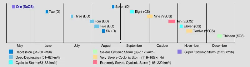 | Twelve | November 9 – 15 | Very severe cyclonic storm | 140 km/h (85 mph) | 990 hPa (29.23 inHg) | Andhra Pradesh, Odisha, West Bengal | Unknown | Unknown | |