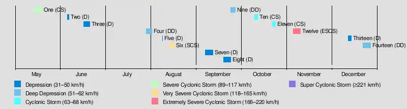 The 1969 North Indian Ocean cyclone season was an active cyclone season. The season has no official bounds but cyclones in the northern Indian Ocean tend to form between April and December. There are two main seas in the North Indian Ocean—the Bay of Bengal to the east of the Indian subcontinent and the Arabian Sea to the west of India. The official Regional Specialized Meteorological Centre in this basin is the India Meteorological Department (IMD), while the Joint Typhoon Warning Center releases unofficial advisories. An average of four to six storms form in the North Indian Ocean every season with peaks in May and November.[1] Cyclones occurring between the meridians 45°E and 100°E are included in the season by the IMD.[2]