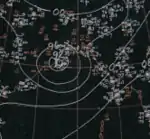 A low-pressure area on the Bay of Bengal intensified to a depression on May 14. Moving west-northwest, it further strengthened to a deep depression on the next day, with ships in the area reporting below gale-force winds and a cyclonic storm on May 16. ESSA-8 satellite imageries reported that the storm has winds equivalent to a Category 2 storm at that time, before crossing the coast between Ongole and Masulipatam (now Machilipatnam) on the next day, maintaining its intensity. Inland, it rapidly weakened to a depression and an area of low-pressure on May 19 and 20, respectively.[3]