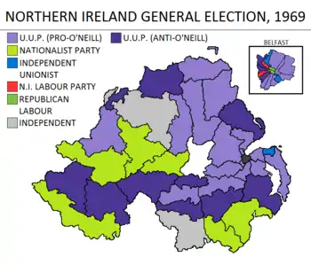 Unlike previous elections that produced a large unambiguous majority for the Ulster Unionist Party, this one gave more complex results. The Ulster Unionists were divided over a variety of reforms introduced by Prime Minister Terence O'Neill and this division spilled over into the election with official Ulster Unionist candidates standing either in support of or opposition to O'Neill and a number of independent pro O'Neill Unionists standing against opposing candidates. The results left O'Neill without a clear majority for his reforms and he resigned not long afterwards.