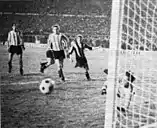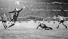 Two moments of the match in Montevideo, (Left): the shot by Verón going near the goal; (right): Errea saving Estudiantes goal