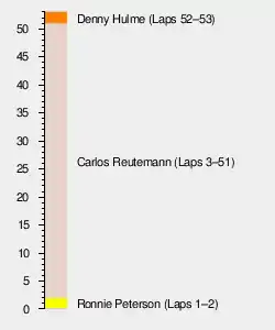 After Hunt spun later on the opening lap, Reutemann moved into second, with Fittipaldi, Hailwood, Ickx and Hulme completing the top six. By lap three, Reutemann took the lead, while Fittipaldi visited the pits to have a plug lead reattached. This promoted Hailwood to third. By this stage, Ickx had dropped behind Hulme, but soon both were past the Yardley McLaren. Peterson began to fade due to brake trouble and was overtaken by Hulme and Ickx. By now Ickx was beginning to come under pressure from the Ferrari of Niki Lauda.[2]
