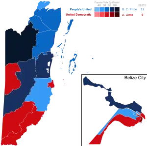 The ruling People's United Party (PUP) won the largest share (12) of seats in the elections. The United Democratic Party – formed the previous year by a merger of the National Independence Party, People's Development Movement and Liberal Party – ran for the first time in this election, winning six seats.[1] The UDP fielded candidates nationwide except in Corozal District, where it supported candidates from the Corozal United Front. The UDP absorbed the CUF after the election.[2]