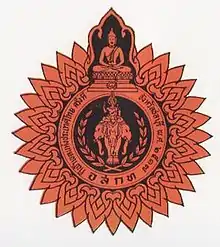 The emblem of 1974 Thailand National Games was an orange circle, with a Buddha statue on top, the emblem of Sports Authority of Thailand on the inside, and surrounded by the text