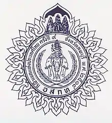The emblem of 1975 Thailand National Games was the blue circle, with the Phra Prang Sam Yod, the temple in Lopburi on top, the emblem of Sports Authority of Thailand on the inside, and surrounded by the text
