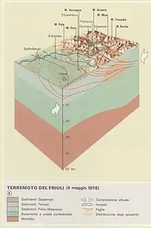 • Finetti, I.; Russi, M.; Slejko, D. (1979), "The Friuli earthquake (1976–1977)", Tectonophysics, 53 (3–4): 261–272, Bibcode:1979Tectp..53..261F, doi:10.1016/0040-1951(79)90070-2