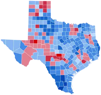 Carter carried 191 of the state's 254 counties, including seventy-four which have never voted Democratic since, namely Martin, Grayson, Chambers, Motley, Gaines, Live Oak, Mason, Sherman, Colorado, Stephens, Lamb, Oldham, Floyd, Real, Fayette, Terry, Donley, Parmer, Dallam, Moore, Hale, Wheeler, Bailey, Armstrong, Hamilton, Goliad, Carson, Childress, Collingsworth, Wilbarger, Wilson, Castro, Eastland, Gonzales, Parker, Hood, Johnson, Anderson, Brazoria, Matagorda, Kinney, Medina, Wharton, Lavaca, Archer, Bosque, Aransas, Bell, Borden, Brown, Burnet, Callahan, Cochran, Coryell, Walker, Shackelford, King, Jeff Davis, Wichita, McLennan, Llano, Hockley, Garza, Hunt, Young, Wood, Jackson, Lynn, Howard, Ellis, and Lampasas Counties.[3]