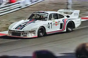 For Le Mans, the Martini-Porsche works team entered their Championship car, the 935/77 iteration. Engineer Norbert Singer had tweaked the aerodynamics and trimmed more weight. The single turbo was replaced by two smaller KKK-turbos that reduced the throttle-lag and lifted the output a bit, to 630 bhp. This propelled the car down the Mulsanne straight at 323 kp/h (201 mph). With Ickx running the 936 and Jochen Mass no longer doing 24-hour events, driving duties were handed, once again, to the other team drivers Rolf Stommelen and Manfred Schurti.[23] Three customer teams entered their 1976-spec cars. Georg Loos had two cars for Klaus Ludwig/Toine Hezemans and Tim Schenken/Hans Heyer (current DRM champion). The French JMS Racing team car was prepared by Henri Cachia for Claude Ballot-Léna with American champion Peter Gregg. The Kremer brothers modified their car further, with more weight-saving and aerodynamic additions. The K2 would be driven by Brits John Fitzpatrick, Nick Faure and Guy Edwards.[22][10] The other entrants in Group 5 were privateers with modified Porsche 911s or 934 turbos. The sole taker of the Le Mans GTX regulations was a modified 3-litre Porsche Carrera RS entered by the Swiss Porsche Club Romand.