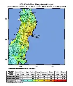 The 1978 Miyagi earthquake (1978年宮城県沖地震, 1978 nen Miyagi-ken-oki jishin) occurred at 17:14 local time (08:14 UTC) on 12 June. The epicentre was offshore of Miyagi Prefecture, Japan. It had a surface wave magnitude of 7.7,[3] JMA magnitude 7.4,[1] and triggered a small tsunami. The earthquake reached a maximum intensity of Shindo 5 in Sendai and caused 28 deaths and 1,325 injuries.